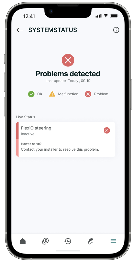 In de Mijn FlexiO gebruikers-app kan een gebruiker klikken op het hamburgerpictogram rechtsonder en vervolgens op Systeemstatus.