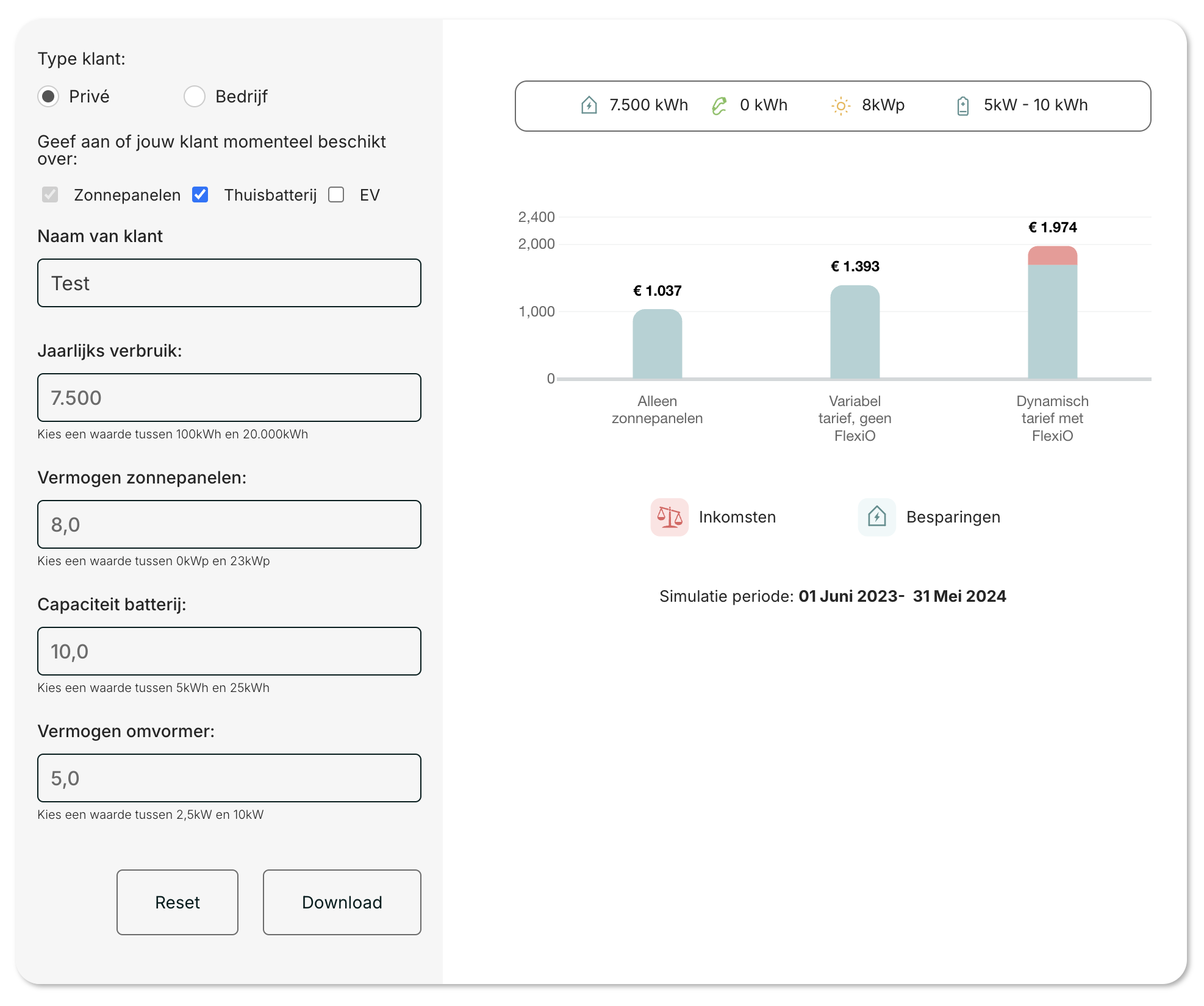 Als je bijvoorbeeld een Batterij hebt met een capaciteit van 10kWH, kan je omvormer een maximaal vermogen hebben van 5kW. Dit komt omdat de meeste accu's beperkt zijn tot een ontlading van 1:2C.Nadat je op "Verzenden" hebt geklikt, je kan de simulatie downloaden en naar je klant sturen.